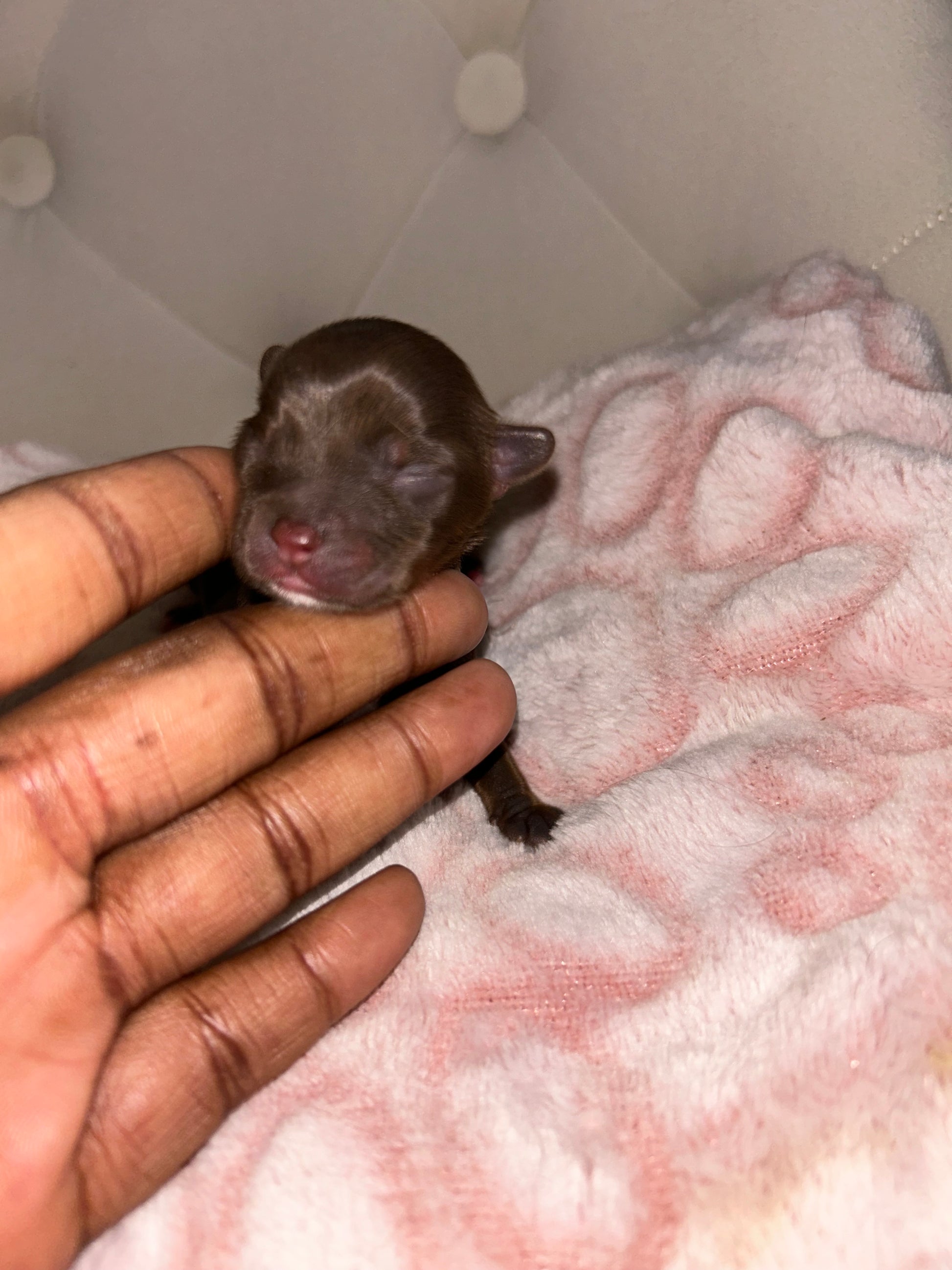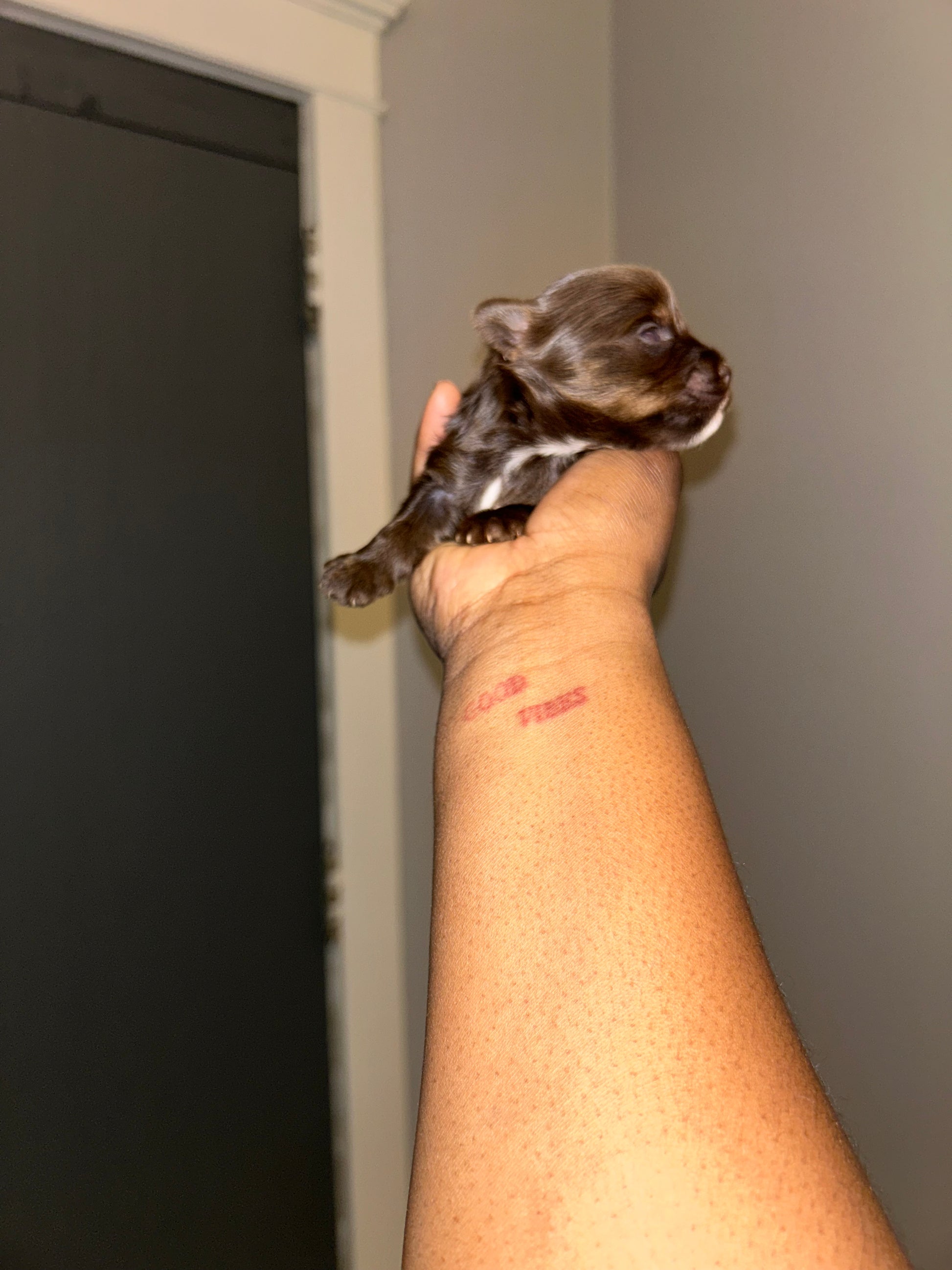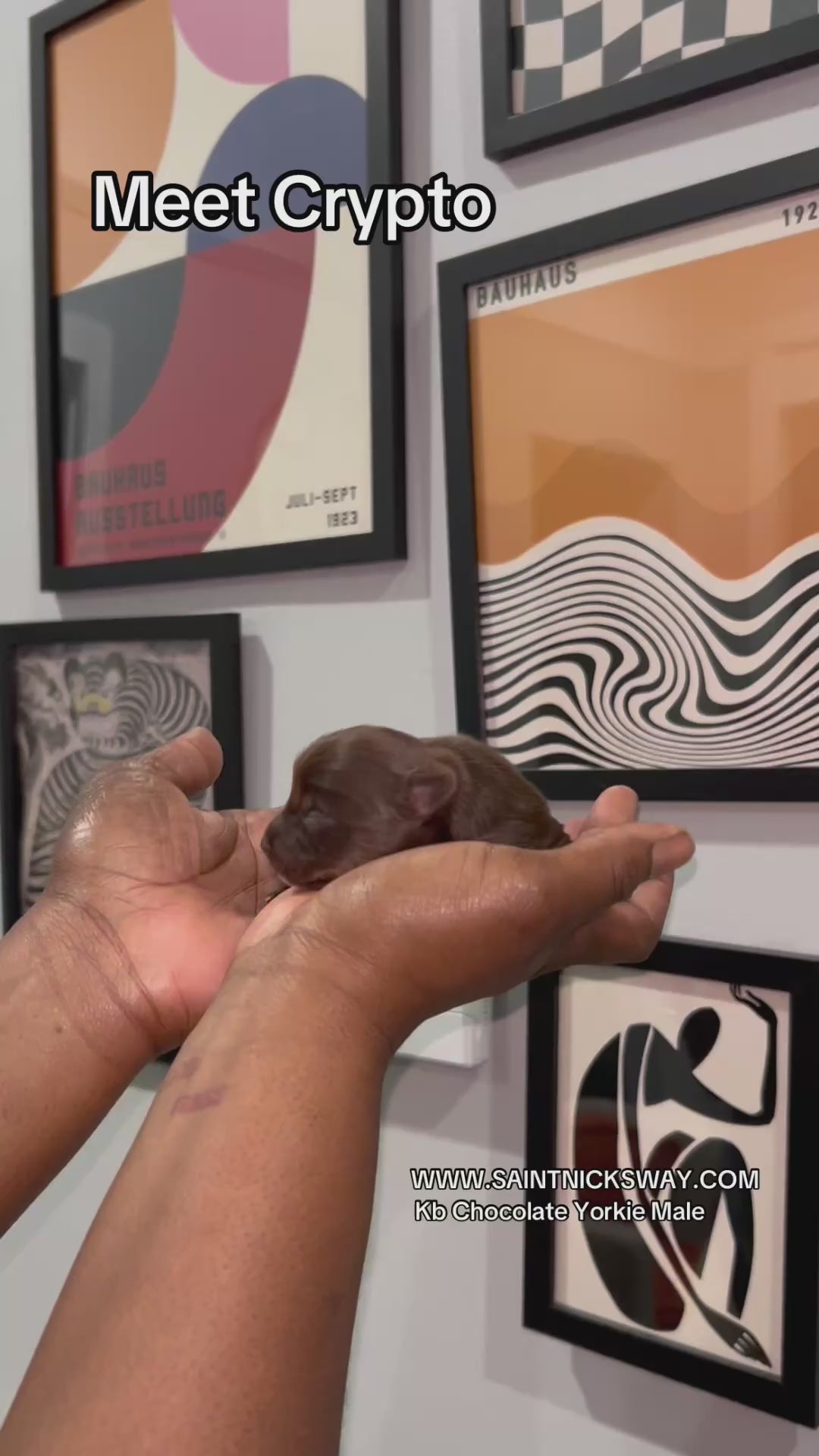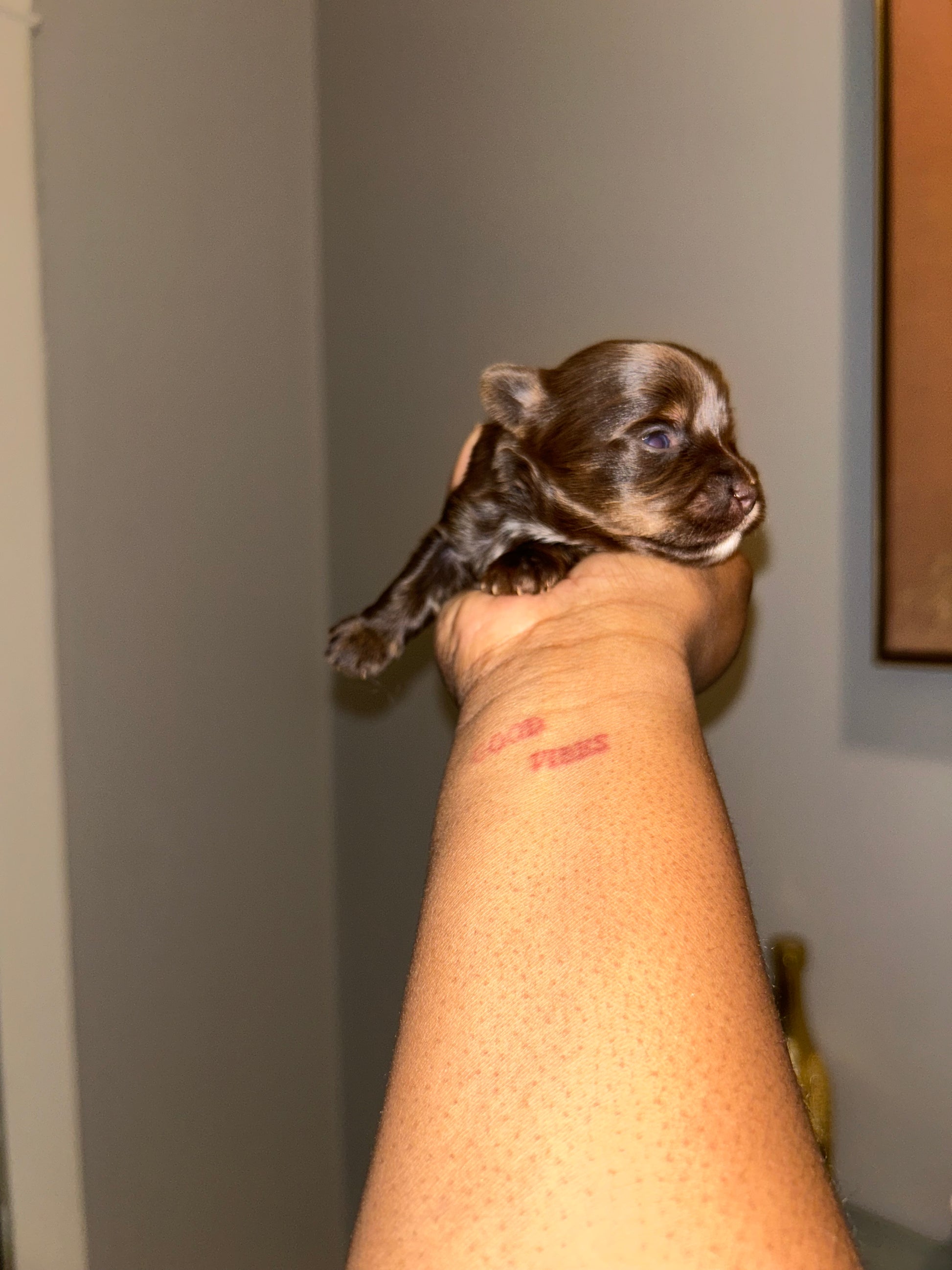 Crypto, a male chocolate Yorkie, is charted to reach a compact 3lbs when fully grown. Born on 12/14, he will be ready for his new home the week of 02/14. He has a unique white spot on his lip and a rich chocolate coat. Perfect for a loving and stylish companion. It is $800 to reserve this little guy via Zelle or Apple Pay.
