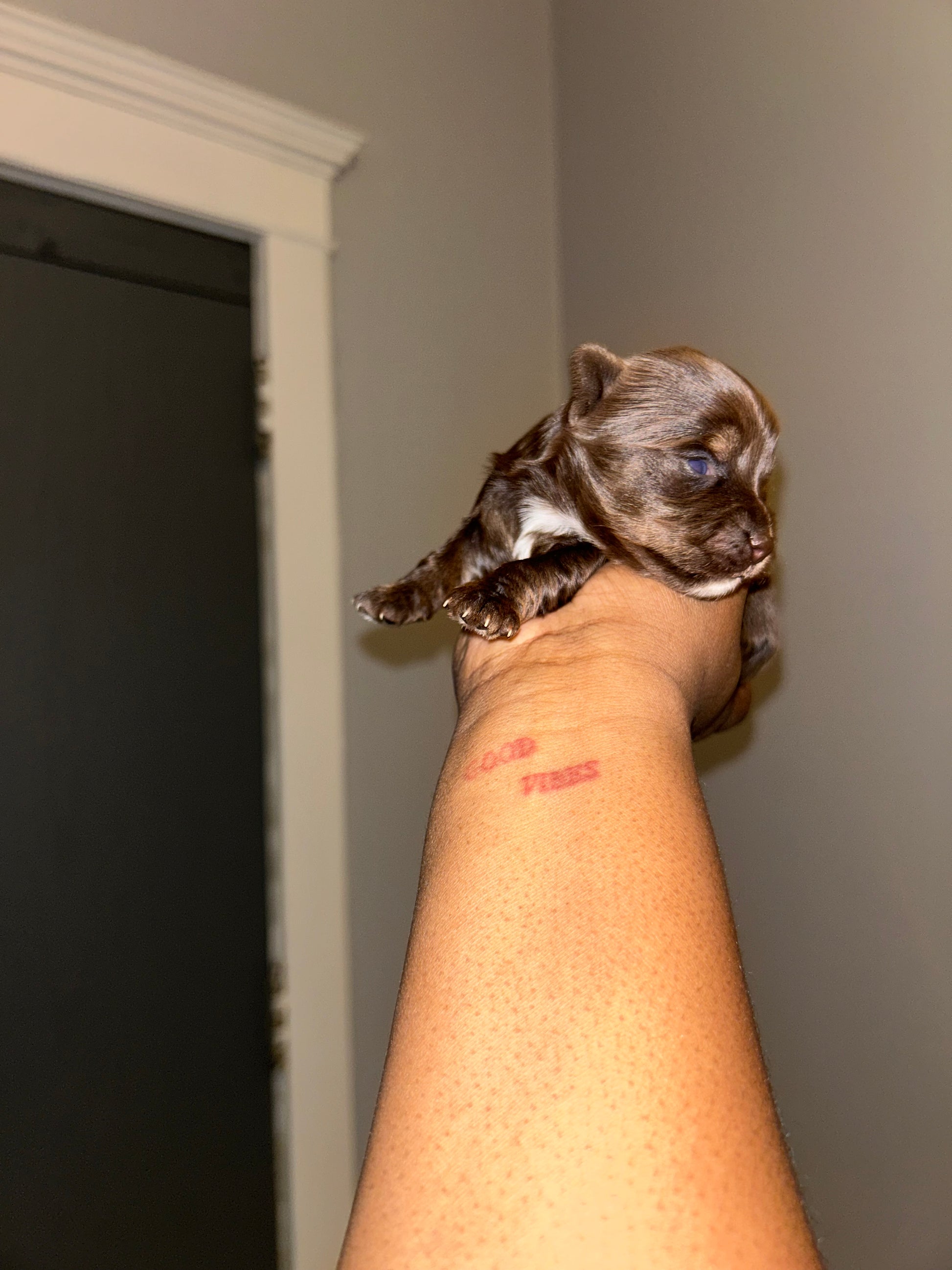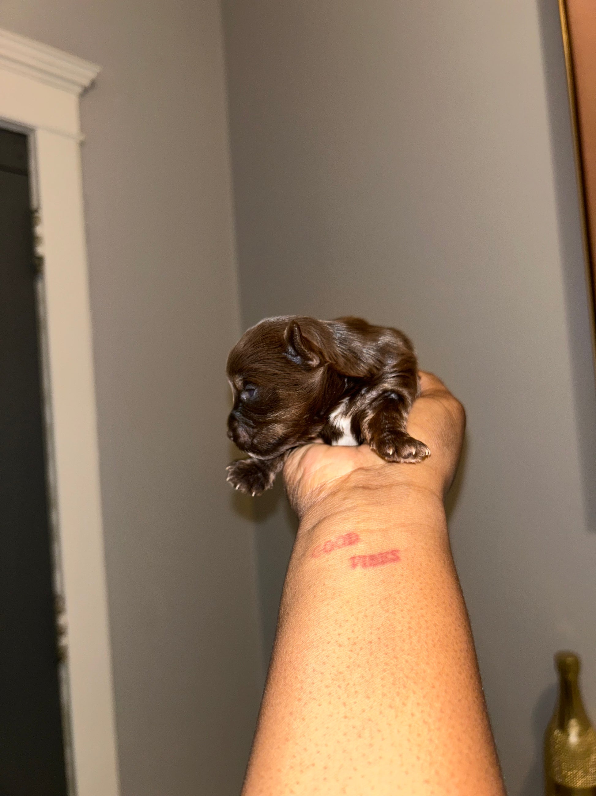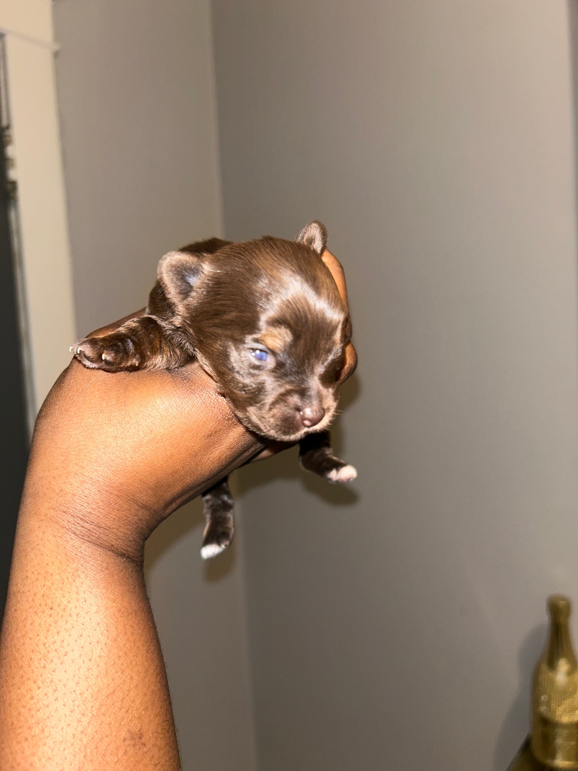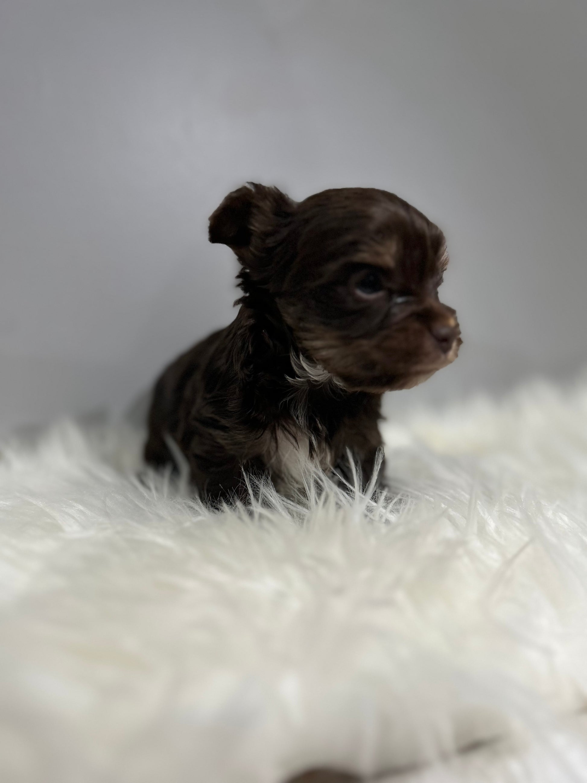 Looking for a sweet companion? Look no further! Meet Visa, the most adorable chocolate Yorkie with a tiny white patch on her chest. She's only 4 grams now, but will grow into a tiny lady. Perfect for Valentine's week pickup. Apply now! It’s $1,000 to reserve this tiny girl via Zelle or ApplePay.